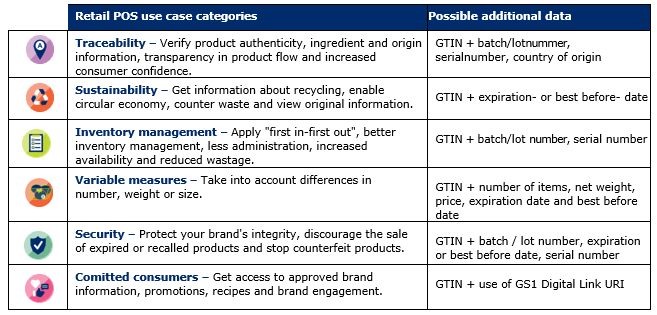 The data encoded in barcodes and used in the store will vary depending on which areas of use are activated. The store needs to be able to at least handle a GTIN in a barcode.